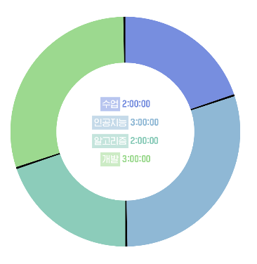 TdsPieChart는 TiTI 프로젝트에서 사용되는 커스텀한 Pie Chart입니다. 각각의 task에 대한 누적시간을 퍼센트로 나타내며, 각 task 사이에는 1도의 여백으로 검은색을 화면에 표시합니다. 또한 애니메이션 효과를 지원하여 사용자에게 부드러운 시각적 효과를 제공합니다.