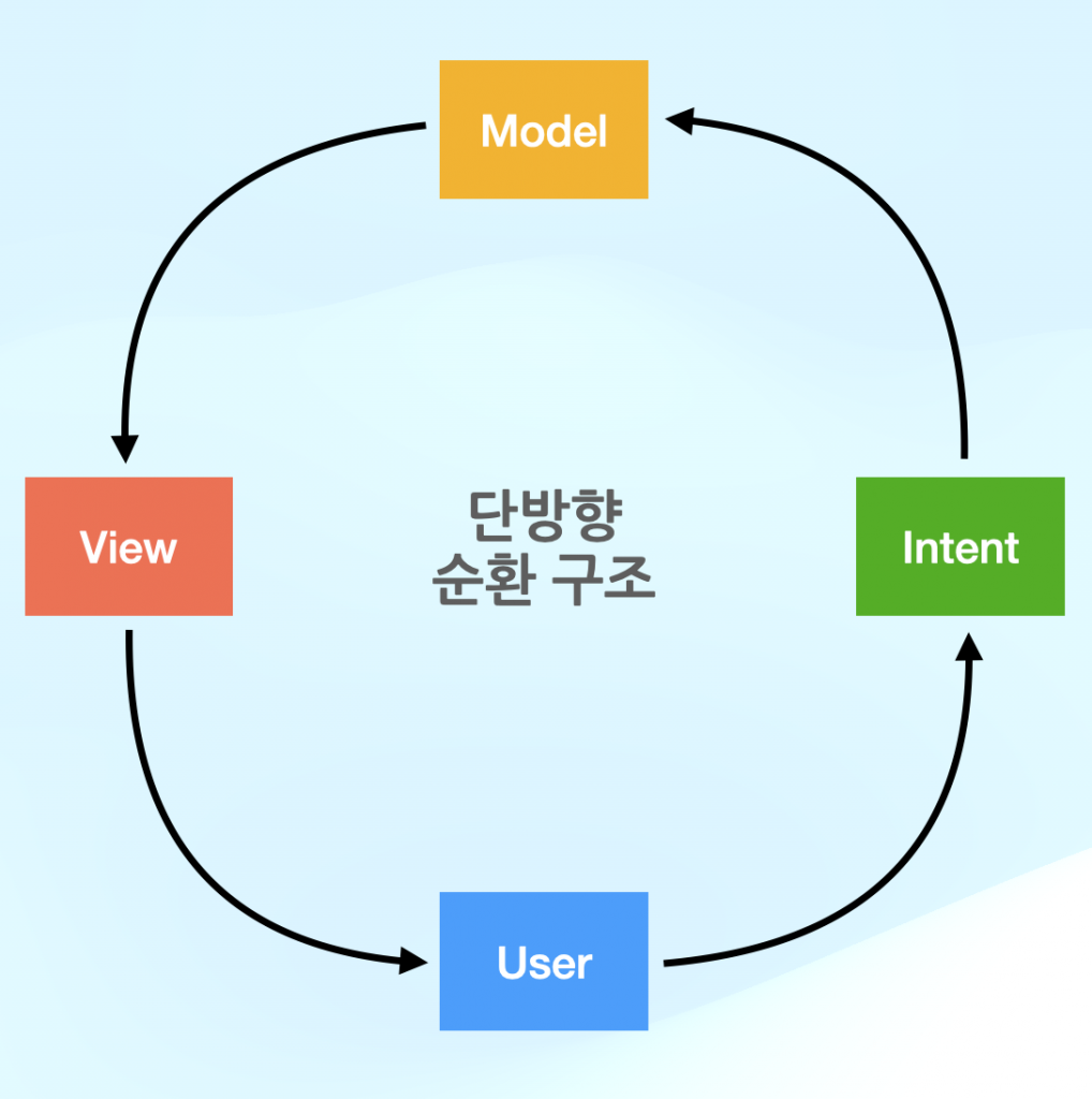 - Intent: 사용자의 액션을 나타내는 이벤트입니다. View가 사용자 입력을 감지하면, 해당 액션을 Intent로 변환하여 Model에 전달합니다.