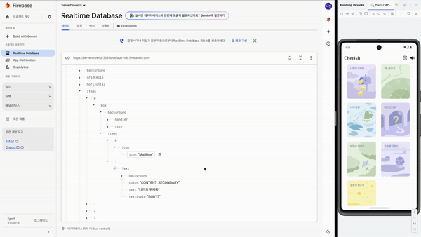 Firebase Realtime Database를 활용하여, 저의 사이드 프로젝트인 Cherish 앱의 메인 화면을 JSON 형태로 서버에서 내려받아 Server-Driven UI로 구현해 보았습니다.