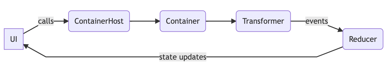 - UI는 ContainerHost 인터페이스를 구현한 클래스에 대해 함수를 호출합니다. 일반적으로 Android에서는 이것이 액티비티(Activity), 프래그먼트(Fragment) 또는 간단한 뷰(View)가 될 수 있습니다. 그러나 Orbit 시스템은 UI 없이도 실행될 수 있으며, 예를 들어 백그라운드 서비스로 실행할 수도 있습니다.