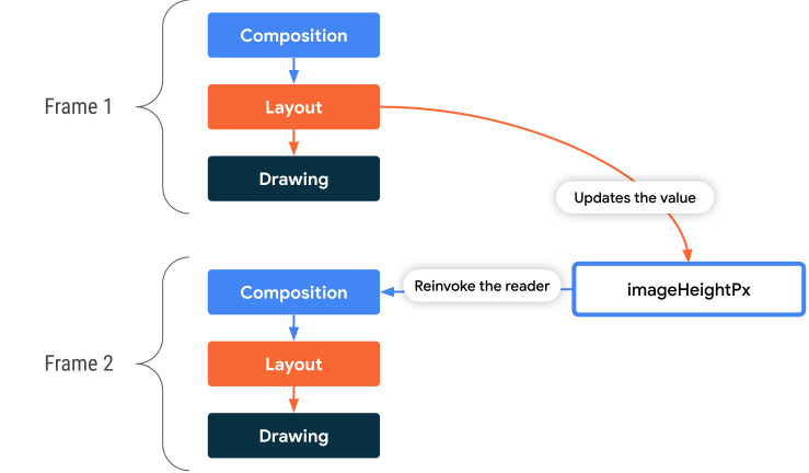 첫 번째 프레임의 구성 단계에서 imageHeightPx의 값은 0이고, 텍스트에는 Modifier.padding(top = 0)이 제공됩니다. 그런 다음 레이아웃 단계가 이어지고, onSizeChanged 수정자의 콜백이 호출됩니다. 이때 imageHeightPx가 이미지의 실제 높이로 업데이트됩니다. Compose는 다음 프레임을 위한 재구성을 예약합니다. 그리기 단계에서 값 변경이 아직 반영되지 않으므로 텍스트는 패딩이 0인 상태로 렌더링됩니다.