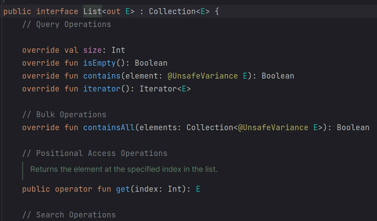앞서 말씀드린 대로, 불변 타입인 List에는 'out' 한정자가 있습니다. 그러나 MutableList를 확인해보면 그 어떤 한정자도 없음을 볼 수 있습니다. 위에서 언급한 모든 이유로 인해 Joshua Bloch의 규칙을 따르고 있습니다.
